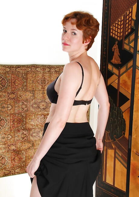 Sexy mature Clarissa in fancy skirt exposing small tits and spreading her legs