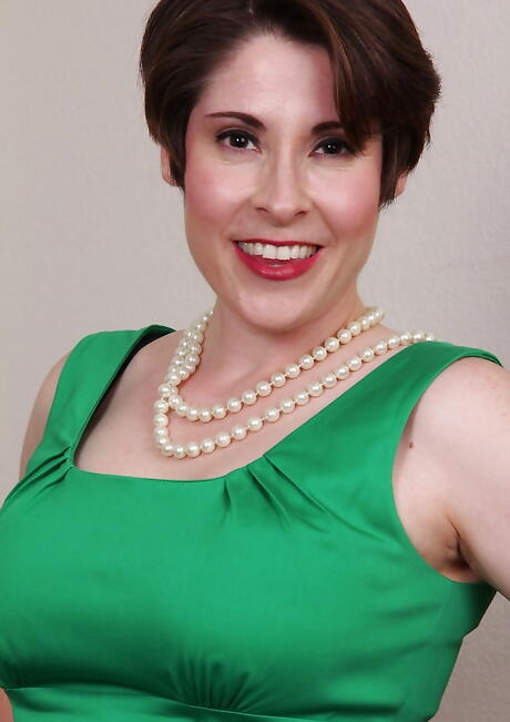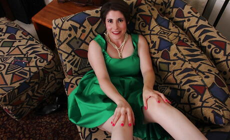 Sexy mature Sadie Jones in fancy skirt showing big titties and puting a toy in her pussy