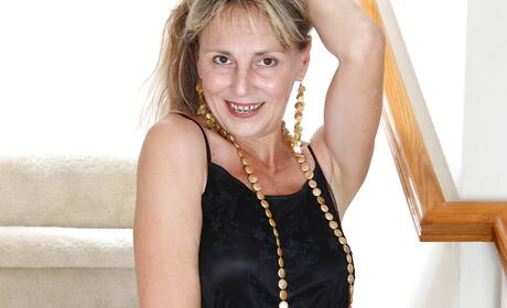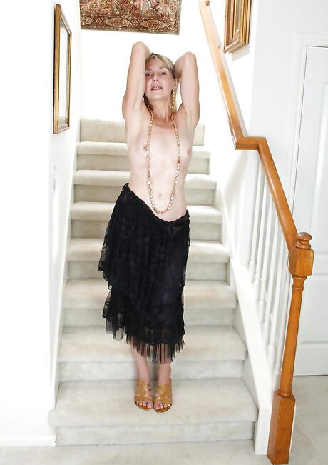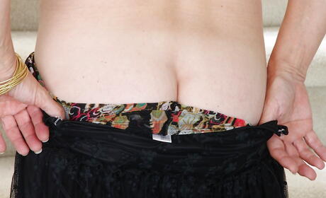 Sexy mature Sophie in sexy skirt reveals small tits and spreads her legs