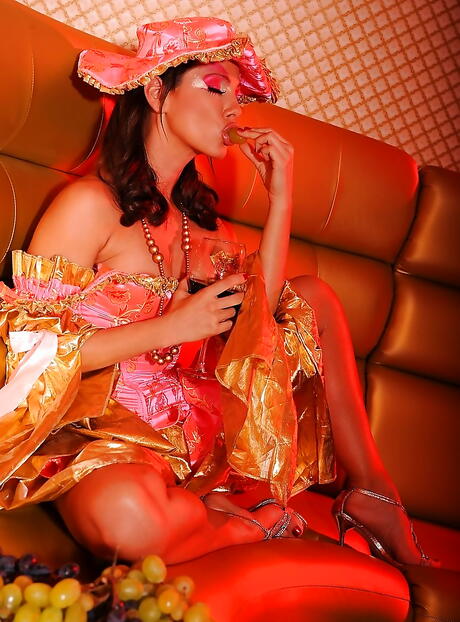 Sexy porn star Sandy in nice skirt exhibiting her ass and spreading her legs