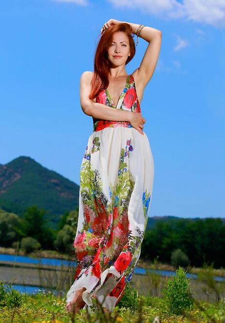 Sexy redheaded teen Callista Simon unveils small tits and butt outside