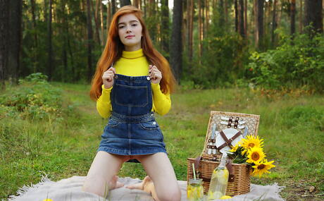 Sexy redheaded young Jia Lissa showing small tits and spreading her legs outside