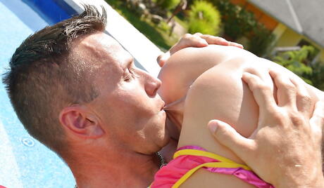 Sexy spanish Susy Gala in sexy bikini take in mouth cock and enjoys a cum shot on her face outside