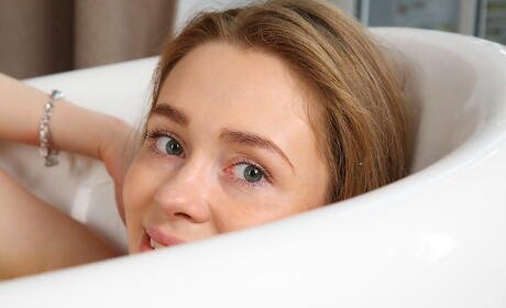 Sexy teen Britney in hot lingerie reveals big tits and spreads her legs in bathroom