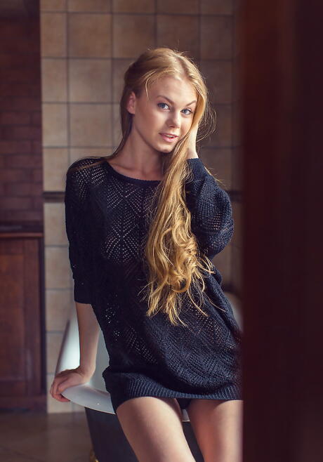 Sexy ukrainian blond youthful Nancy A in fancy skirt exhibiting her butt and hairy pussy in bathroom