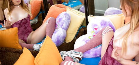 Shapely american youthful Alex Blake reveals her butt in shorts and spreads her legs