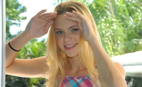 Shapely american youthful Destiny Garnet in sexy shorts uncovering tiny tits and spreading her legs outside