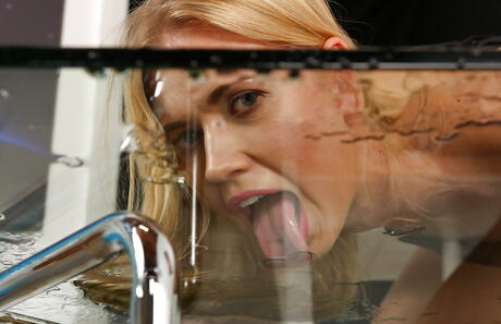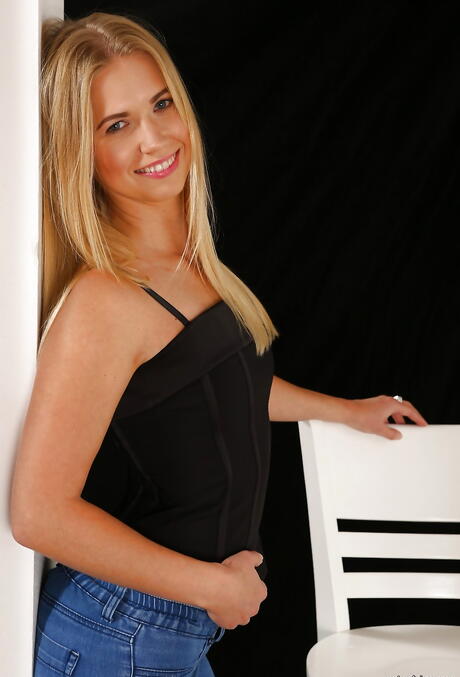 Shapely blond youthful Violette Pink exposes tiny tits and plays with dildo