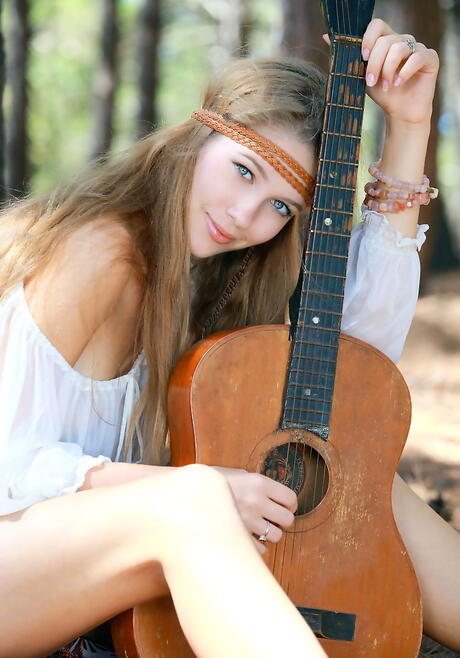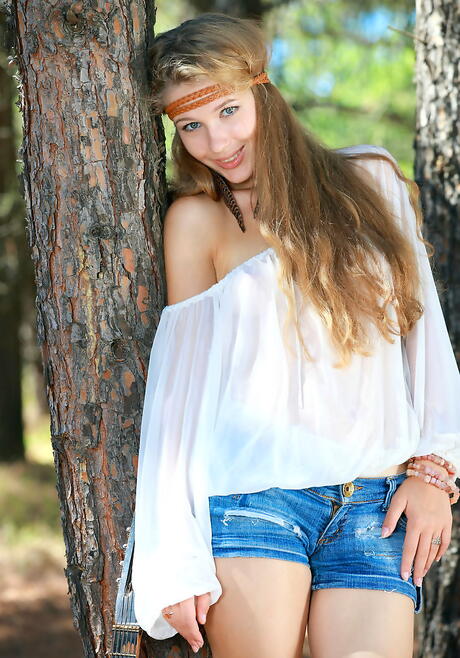 Shapely blonde teen Genevieve Gandi in shorts exposes small tits and shaved pussy outdoor