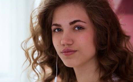 Shapely dark hair teen Jasmina unveils tiny tits and bald pussy
