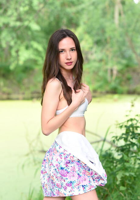 Shapely dark-haired young Dama in lingerie revealing her ass and spreading her legs outside