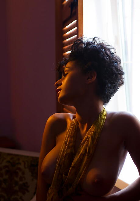 Shapely dark-haired young Pammie Lee in sexy skirt baring big tits and hairy pussy