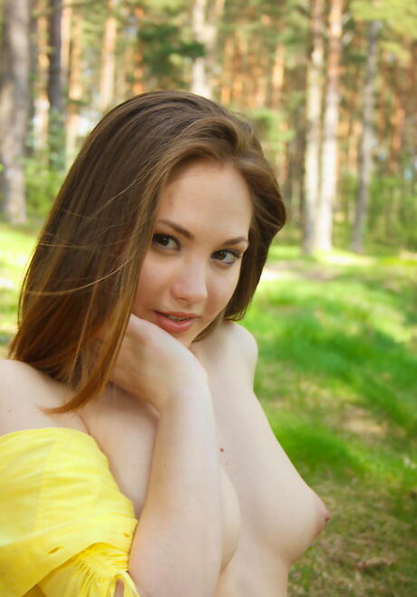 Shapely young Mira D unveiling tiny tits and spreading her legs outside