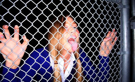 Shapely young Zoe Mae in skirt spreading her legs outside