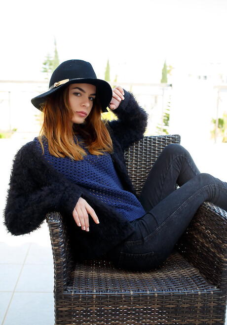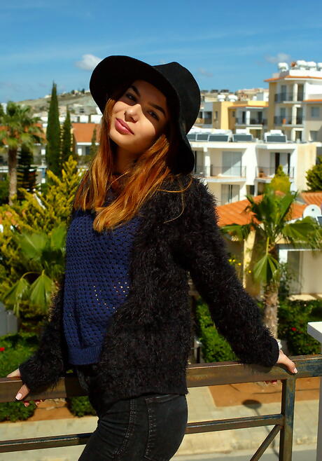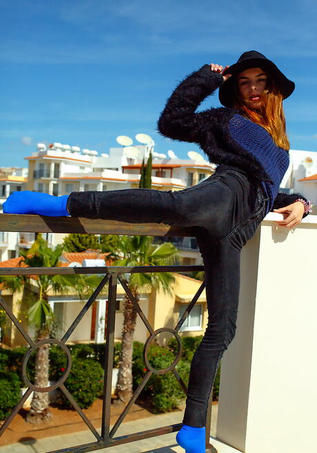 Shapely youthful Debora A in sexy jeans showing her butt and spreading her legs near the pool