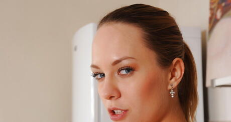 Slender american hottie Blue Angel in fancy shorts exhibits small tits and spreads her legs