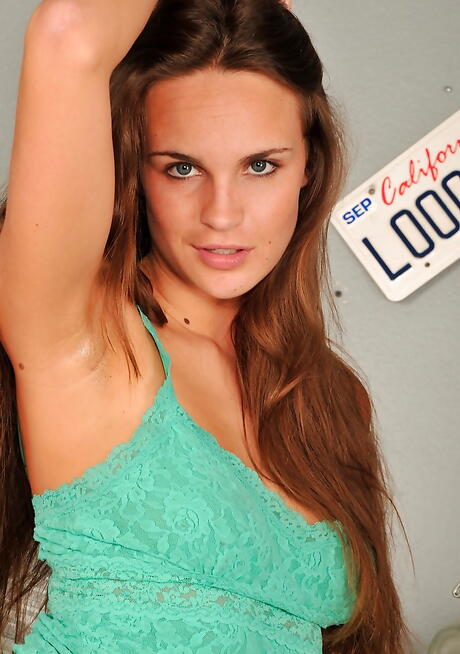 Slender american teen Teal Conrad in fancy shorts showing big tits and spreading her legs