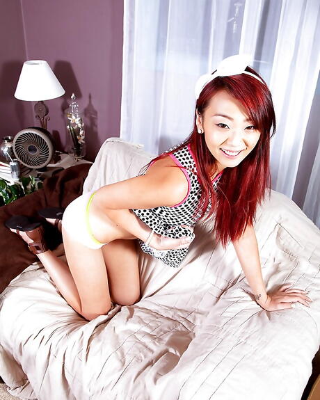 Slender asian redhead young Layla Mynxxx in fancy skirt reveals small tits and butt