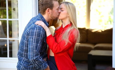 Slender blond teen Abigaile in sexy skirt blows on cock