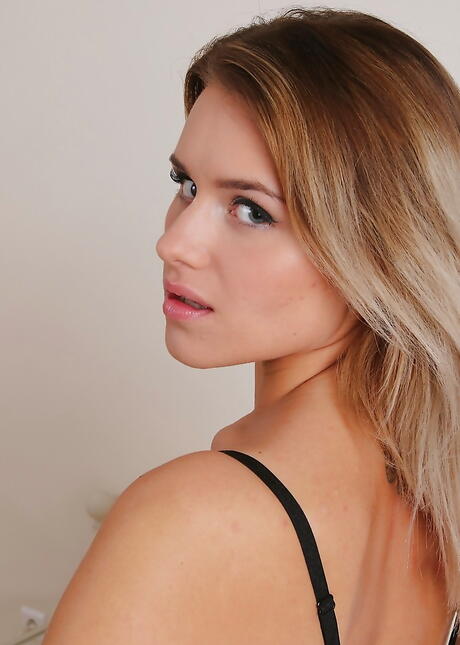 Slender blonde youthful Linda Ratonne in sexy lingery uncovers small tits and shaved pussy