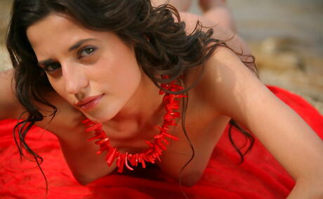 Slender brunette young Irina B bares tiny tits and spreads her legs at beach