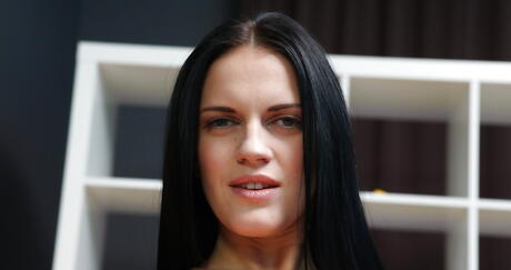 Slender dark-haired babe Mia Michele unveiling small tits and toying her snatch