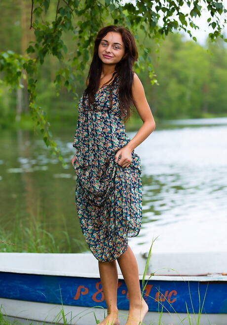 Slender dark-haired teen Dominika Dark baring small tits and ass outdoor