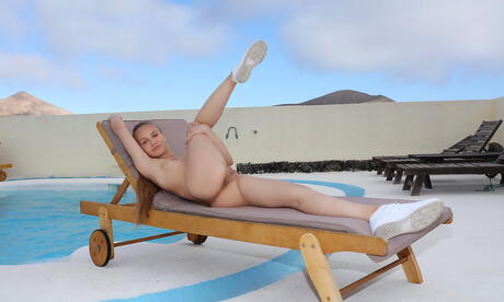 Slender dark-haired teen Lucretia K exposes tiny tits and spreads her legs at pool
