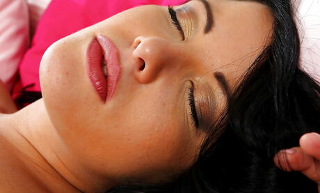 Slender dark-haired young Aaliyah Archer exhibiting big boobies and jerking off