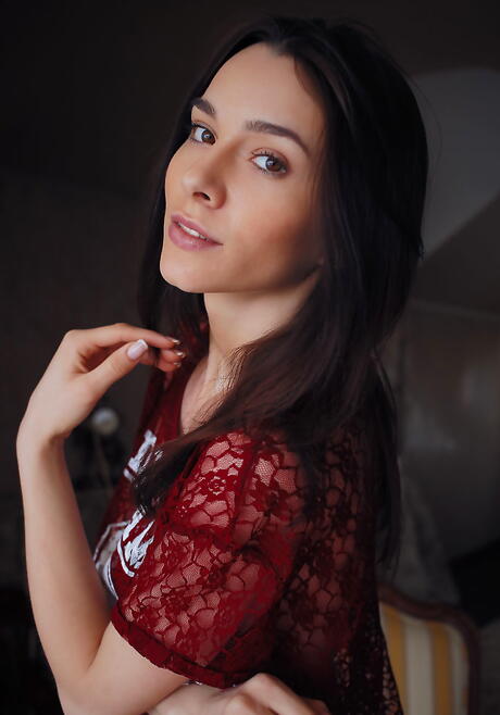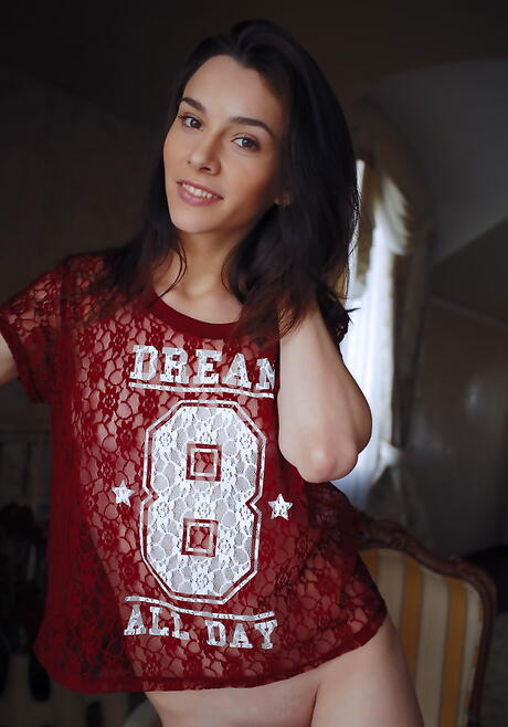 Slender dark-haired youthful Adel Morel exhibits tiny tits and spreads her legs
