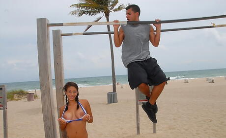 Slender latina teen Jamie Valentine in sexy bikini exhibits big boobies and sexy ass at beach