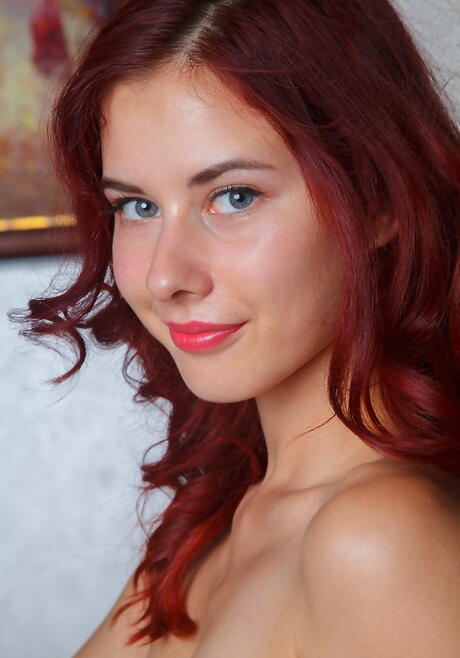 Slender redhead teen Pearl Ami baring her butt and spreading her legs