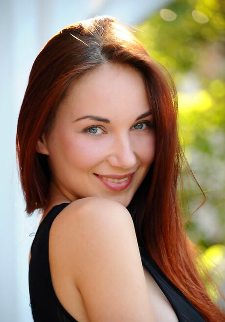 Slender redheaded young Ledona in sexy undies exhibiting big boobies and spreading her legs outdoor