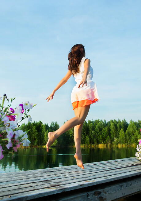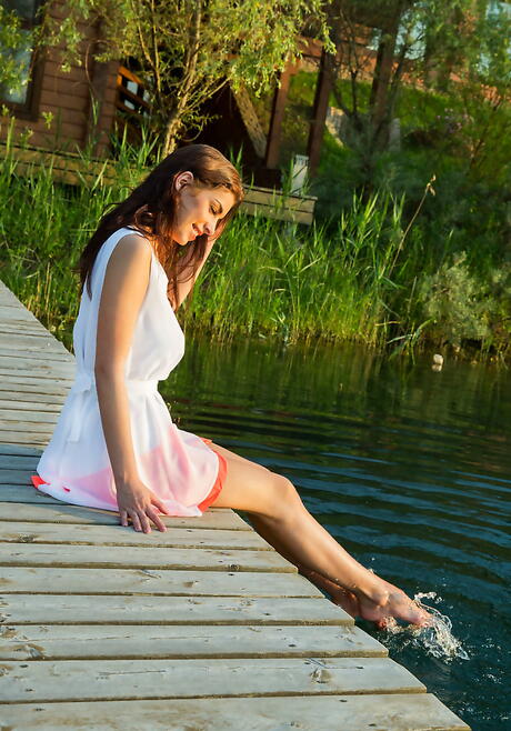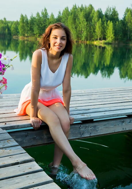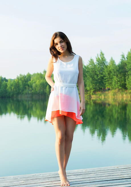 Slender ukrainian youthful Evita Lima in skirt revealing big titties and shaved pussy outside