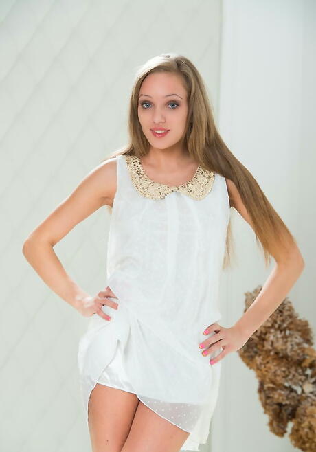 Slender youthful Tayra A in skirt exhibits small tits and spreads her legs