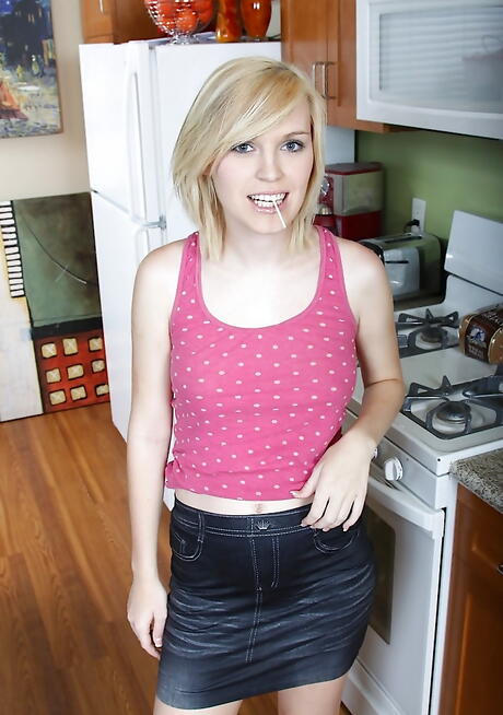 Slim american blonde teen Amanda Bryant uncovers tiny tits and shaved pussy