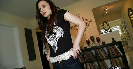 Slim american dark-haired cutie Amy Faye in panties shows tiny tits and masturbates