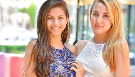 Slim beauties Nina North and Serena Westbrook have a passionate lesbian foreplay at pool