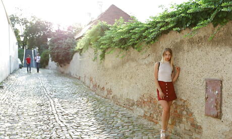 Slim blonde teen Dominica in fancy skirt exposing tiny tits and shaved pussy outside