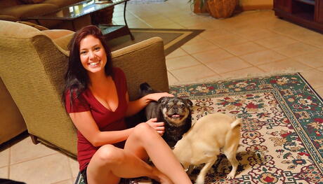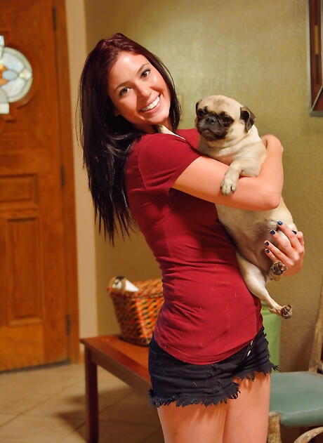 Slim dark-haired teen Janessa in fancy shorts uncovers small tits and plays with dildo near the pool