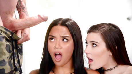Slim girls Jenna Reid and Maya Bijou blows on huge dick and gets a cum blast on faces