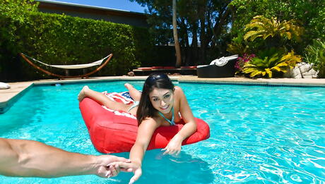 Slim latina teen Kylie Sinner in sexy panties work with wet lips on dick and takes a cum shot near the pool