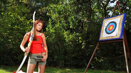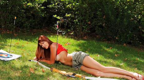 Slim red-haired youthful Kamila Hermanova in shorts showing big knockers and hot ass outside