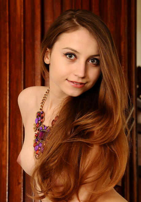 Slim redheaded teen Nicolina unveiling tiny tits and shaved pussy