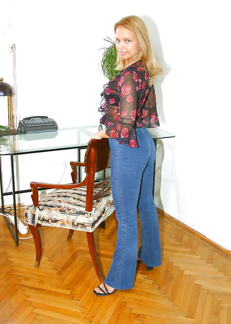 Slim teen Andrea in tight jeans exposes her butt and sissy