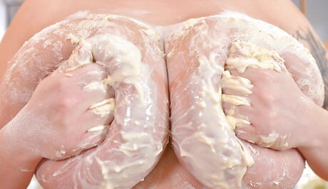 Splendid brittish brunette bbw Leanne Crow in hot erotic scene in kitchen