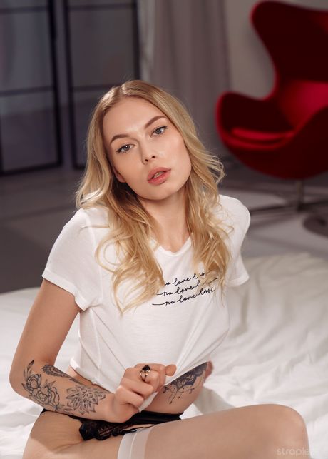 Young lesbians Mimi Cica and Nata Ocean have sex with a strapon in a bedroom