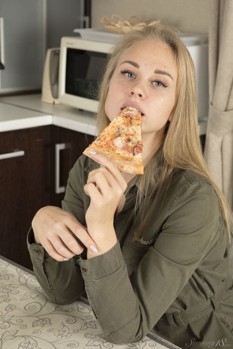Bashful teen Orika goes nude on a kitchen counter in a playful manner