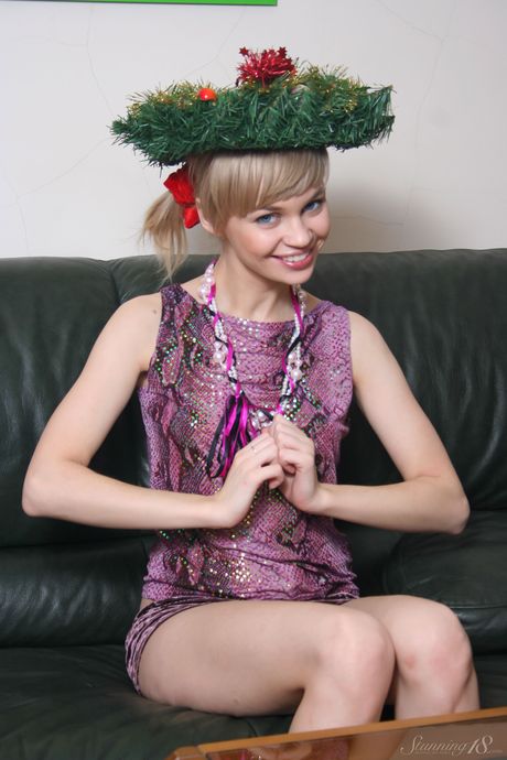 Blonde teen Cindy B gets naked in over the knee socks on a stool