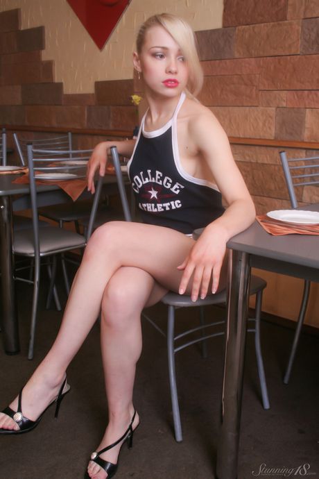 Blonde teen Olya N removes a black dress and thong set to pose nude